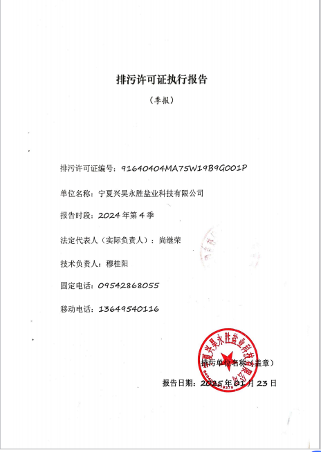 寧夏興昊永勝鹽業科技有限公司2024年第4季度排污許可執行報告